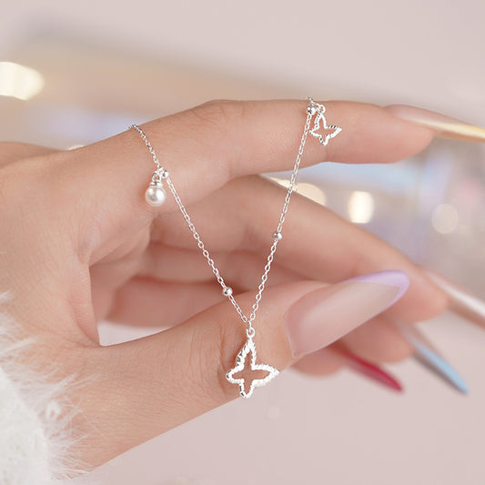 E廠【YC0925N】S925純銀蝴蝶珍珠項鍊小清新甜美韓風韓版小眾設計鎖骨鏈 25.07-1