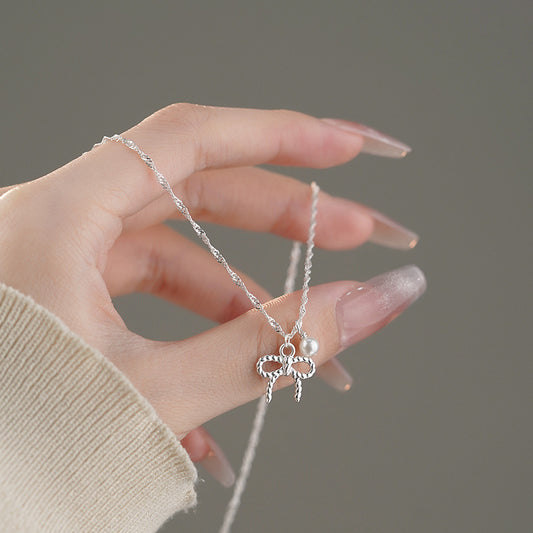 E廠【YC2607N】S925純銀甜蝴蝶結珍珠項鍊女輕奢高級感小眾設計鎖骨鏈 25.03-1
