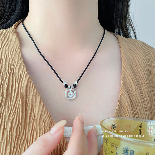 E廠【YC2725N】S999足銀銅錢圓環平安扣黑繩項鍊女復古名族風鎖骨鍊頸飾 24.01-4
