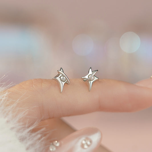 E廠【YC2912E】S999足銀四芒星珍珠耳環潮流韓風時尚小眾設計養耳洞耳飾 25.04-2