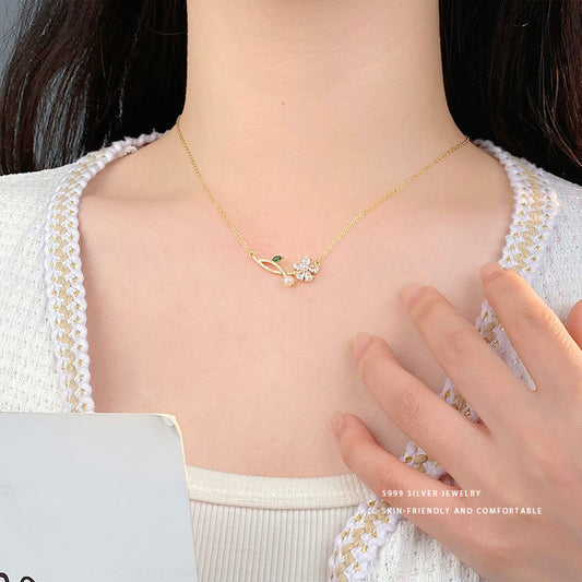 E廠【YC3302N】S999足銀百搭花朵珍珠項鍊女小眾設計感甜美鎖骨鍊頸飾 24.04-2