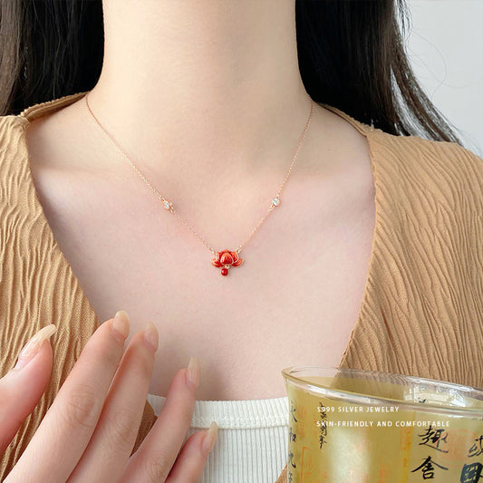 E廠【YC3496N】S999足銀本命年紅蓮花項鍊女新中式高級感國風鎖骨鍊頸飾 24.02-1