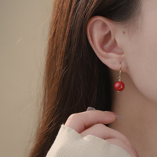 E廠【YC3453E】S925銀國潮硃砂耳鉤女民族風紅復古極簡圓形新中式耳環 25.02-2