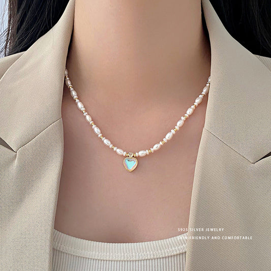 E廠【YC3528N】S925純銀幻彩心型珍珠項鍊女法式浪漫高級感公主風鎖骨鏈 24.01-3