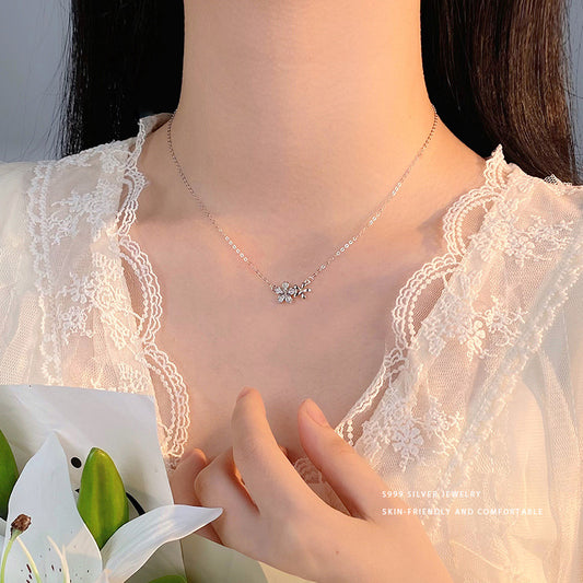 E廠【YC3779N】S999足銀鑲鑽兩朵花朵項鍊女時尚個性清新文藝氣質鎖骨鏈 24.05-4