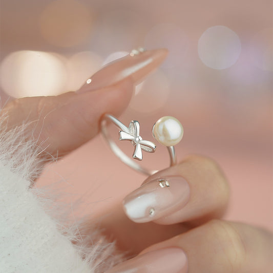 E廠【YC4002R】S925純銀小眾設計蝴蝶結珍珠戒指女ins風甜美溫柔開口戒 25.03-4