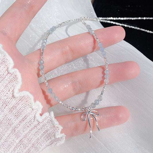 E廠【YC4071N】S925純銀甜蝴蝶結碎銀子海藍寶項鍊女ins高級感鎖骨鍊 24.09-3