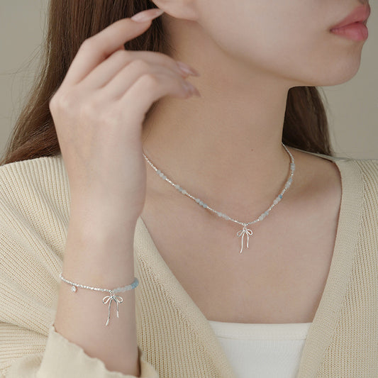 E廠【YC4071N】S925純銀蝴蝶結碎銀子海藍寶項鍊甜美清新套裝高級首飾 25.03-1