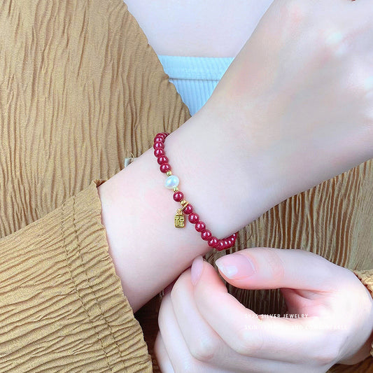 E廠【YC5309SL】S925純銀本命年福牌紫金砂珍珠手鍊女新中式紅紅火火 24.02-3