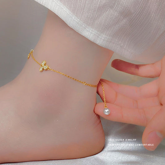 E廠【YC5319SL】S925純銀簡約三葉草花朵珍珠腳鍊女小眾設計感夏季新款配件 24.04-3