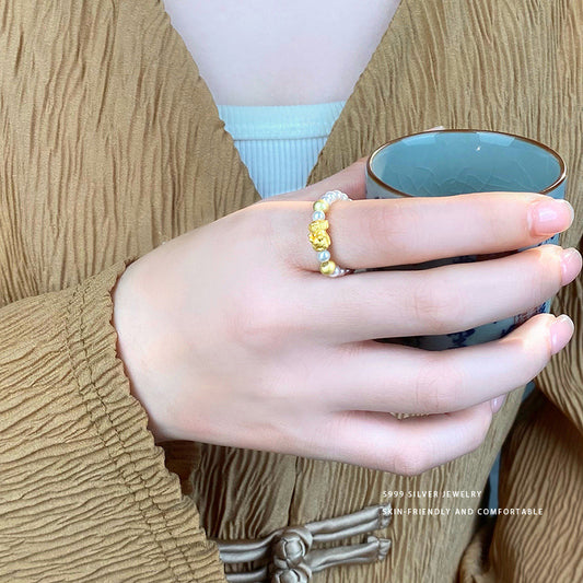 E廠【YC5333R】S999足銀國風貔貅珍珠戒指女輕奢新中式國潮可愛神獸指環 24.02-3