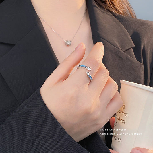 E廠【YC5355R】S925銀藍色星河四芒星戒指女夏季時尚個性開口戒新款指環 24.04-3