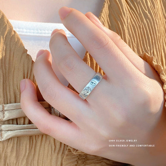 E廠【YC5370R】S999足銀中式平安喜樂貓咪戒指女可愛國風國潮可調指環 24.05-5