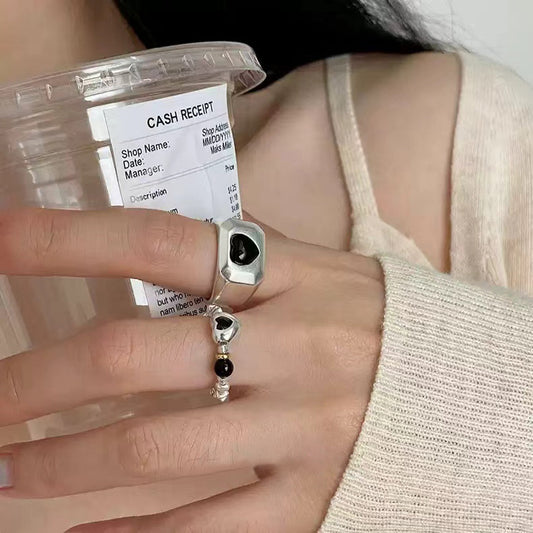 E廠【YC5379R】S925純銀時尚黑瑪瑙愛心戒指女冷淡風個性帥氣指環開口戒 24.03-1