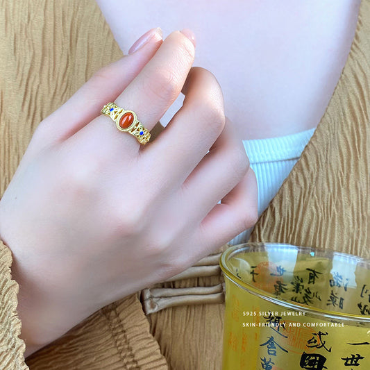 E廠【YC5394R】S925純銀本命年南紅瑪瑙橢圓環女中式美學宮廷風開口戒 24.02-1