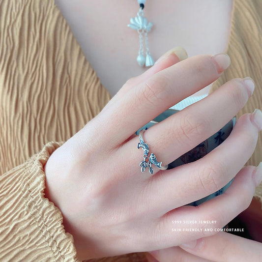 E廠【YC5406R】S999足銀復古做舊雙魚鑲葉戒指簡約大氣國風本命年開口戒 24.01-3