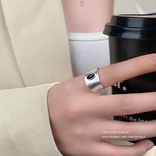 E廠【YC5410R】S925銀時尚寬面橢圓瑪瑙戒指女冷淡風個性帥氣開口指環 24.04-2