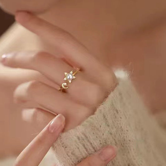 E廠【YC5441R】S925銀時尚星星月亮珍珠戒指女小眾設計輕奢高級感開口戒 24.03-5