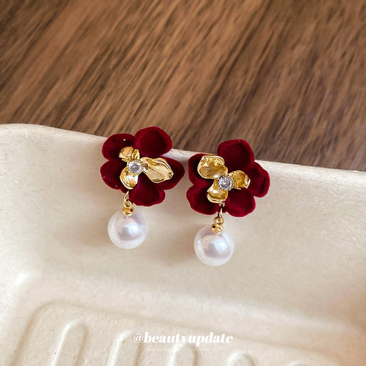 A廠【HE24041】925銀針植絨鋯石花朵珍珠耳環女法式小眾耳環時尚氣質耳環輕奢高級感 24.12-1