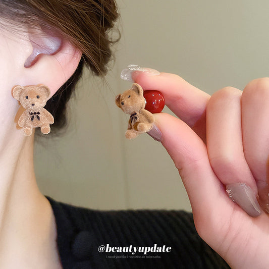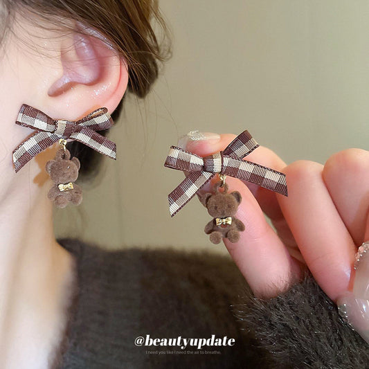 A廠【HE24052】925銀針韓系蝴蝶結小熊植絨耳環女甜美少女心耳環輕奢高級感耳飾秋冬 24.12-1
