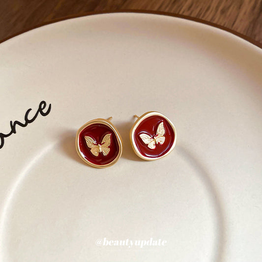 A廠【HE24039】925銀針安可拉紅色滴油蝴蝶耳環復古時尚百搭耳環輕奢高級感耳飾秋冬 24.12-1