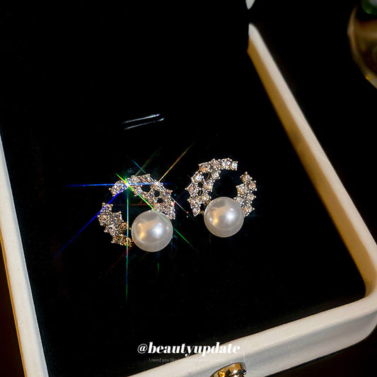 A廠【HE24086】925銀針鑲鑽月亮人造珍珠耳環女小眾百搭耳環時尚氣質耳環輕奢高級感 24.12-2
