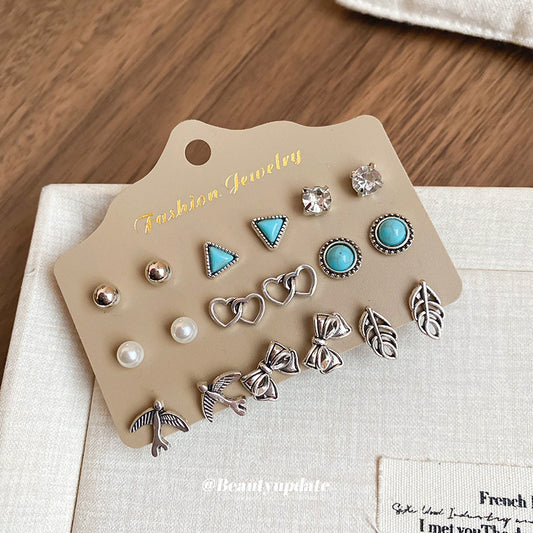 A廠【HE24135】925銀針鑲鑽幾何珍珠耳環套裝女復古小眾耳環時尚氣質耳環輕奢高級感 24.12-2