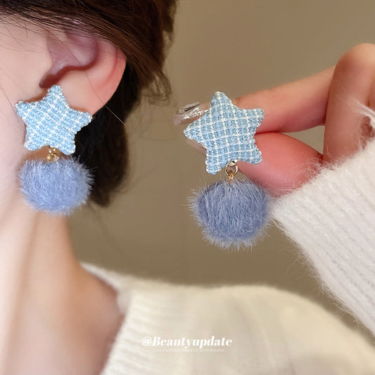 A廠【HE24208】925銀針小清新格紋星星毛絨耳環女少女心耳環小眾百搭耳飾秋冬高級感 24.12-2
