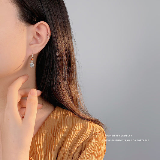 E廠【YC9307E】S999足銀國風漢字紅瑪瑙耳鉤女民族風復古做舊耳環耳環 24.05-5