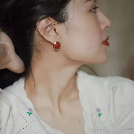 E廠【YC9803E】S925純銀復古紅色橢圓形耳環女法式小眾耳環氣質港風耳飾品 24.03-4