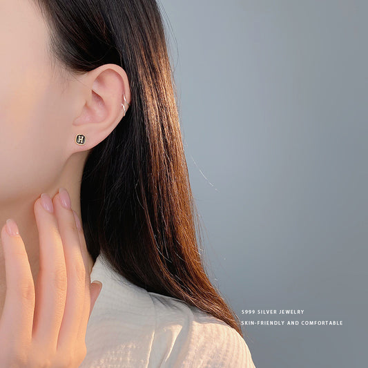 E廠【YC9783E】S999足銀時尚黑色滴膠H螺絲耳環女個性冷淡風高級感耳飾 24.03-3