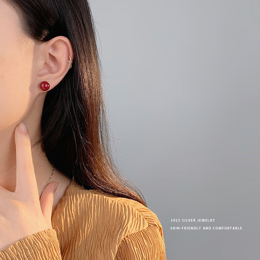 E廠【YC9894E】S999足銀簡約紅色圓珠耳環女本命年喜慶高級感顯白耳飾品 24.02-3