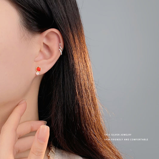 E廠【YC9877E】S925純銀小巧紅色圓珠珍珠耳環女精緻喜慶百搭顯白耳飾 24.02-3