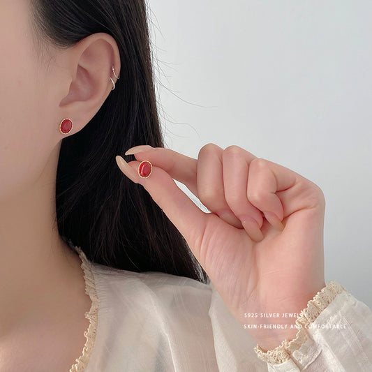 E廠【YC9889E】S925純銀本命年仿硃砂橢圓耳環女紅火喜慶高級感耳環耳環 24.02-1