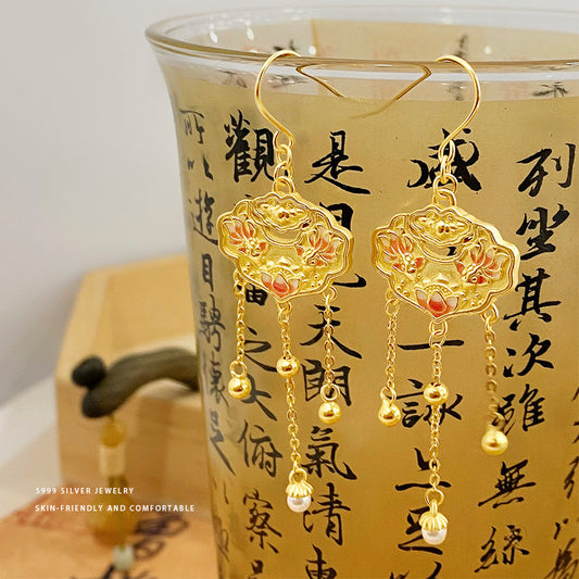 E廠【YC9908E】S999足銀本命年雙魚蓮花平安鎖珍珠耳墜女國風高級感耳飾 24.02-3