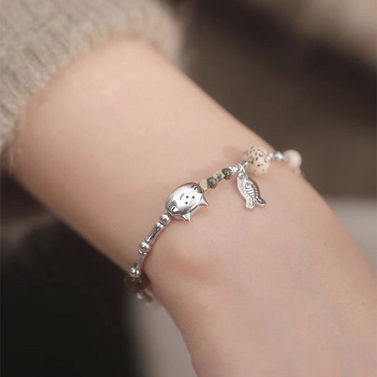 F廠【DQ0125S】S925純銀貓咪碎銀子手鍊女時尚高級感小魚手環百搭手飾個性 25.04-3