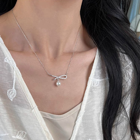 F廠【DQ0333N】芭蕾少女緞帶蝴蝶結施家仿珍珠項鍊女S925純銀輕奢小眾鎖骨鏈 25.02-4