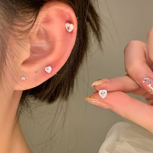 F廠【DQ10022E】S925銀粉紅愛心耳環女小眾設計高級感心形鋯石耳骨釘疊戴耳飾 25.10-1