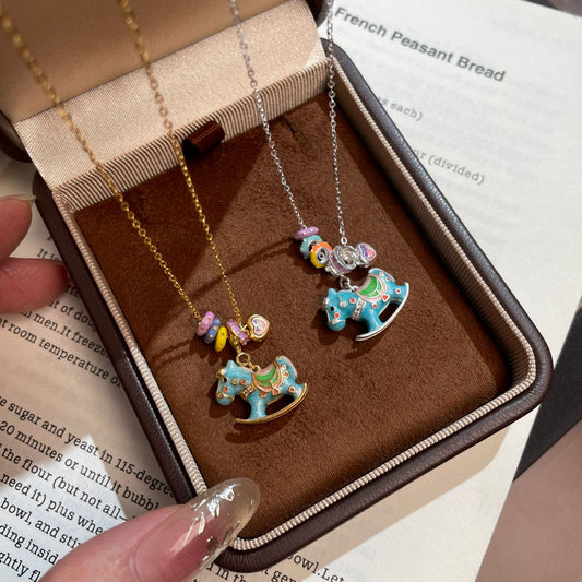 F廠【DQ1038N】S925純銀輕奢小眾搖搖木馬項鍊女琺瑯馬卡龍歡樂小彩馬鎖骨鏈 25.08-5
