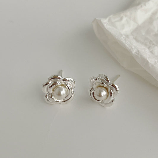 F廠【DQ11483E】韓版簡約S925純銀山茶花仿珍珠耳環女小清新甜美花朵百搭耳飾 25.10-1