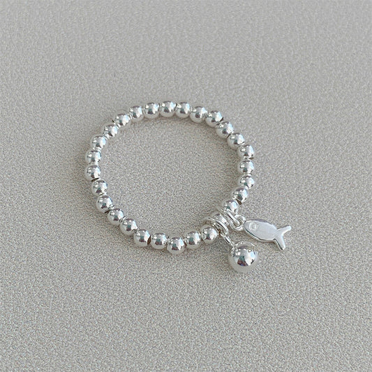 F廠【DQ8895R】S925純銀ins簡約小魚圓珠戒指女手工設計彈力繩銀珠串珠指環 24.12-1