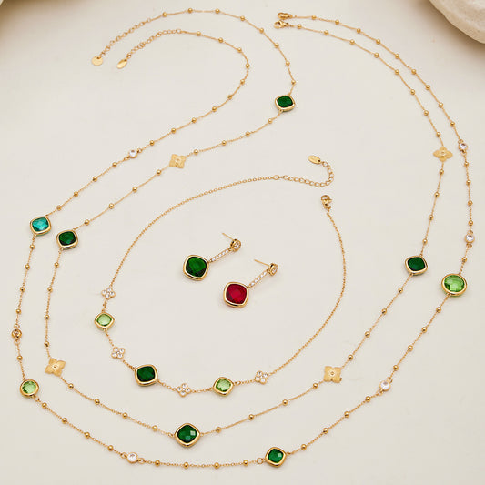 B廠【TXP509】不銹鋼四葉花鑲鋯石切面包邊石頭手鍊長款毛衣鏈項鍊耳環首飾套裝 25.12-1