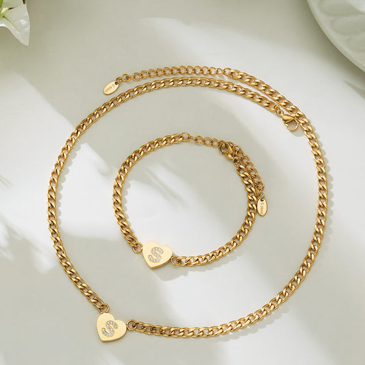 B廠【RP021】不銹鋼愛心字母鑲嵌鋯石吊墜項鍊手鍊套裝 歐美個性首飾鍍18k真金 25.12-1