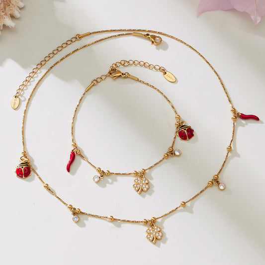 B廠【TXP502】不鏽鋼5A鋯石幸運草瓢蟲多配件手鍊項鍊首飾組鍍18k真金不掉色 25.11-4
