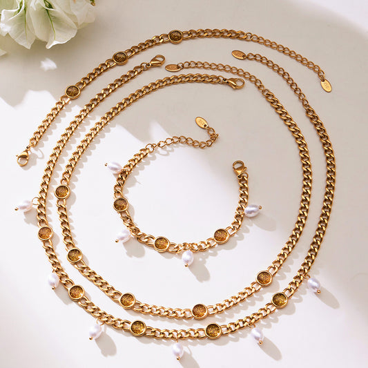 B廠【TXP496】歐美熱銷款仿珍珠流蘇項鍊手鍊不鏽鋼鍍18k金ins小眾設計首飾套裝 25.11-4
