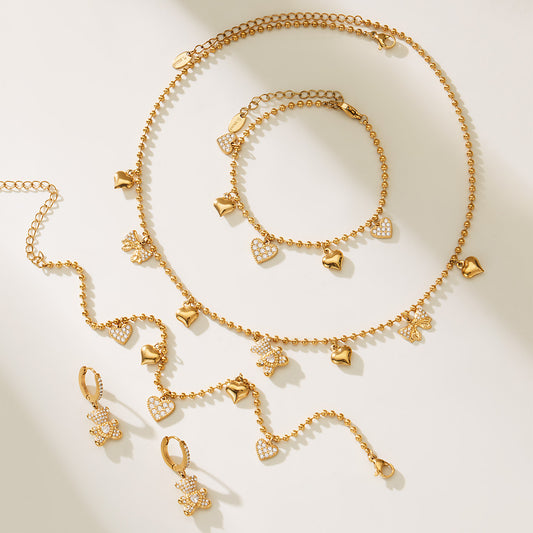 B廠【TXP500】不銹鋼5A鋯石滿鑽小熊蝴蝶結愛心多配件吊墜項鍊手鍊耳環首飾套裝 25.11-4