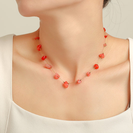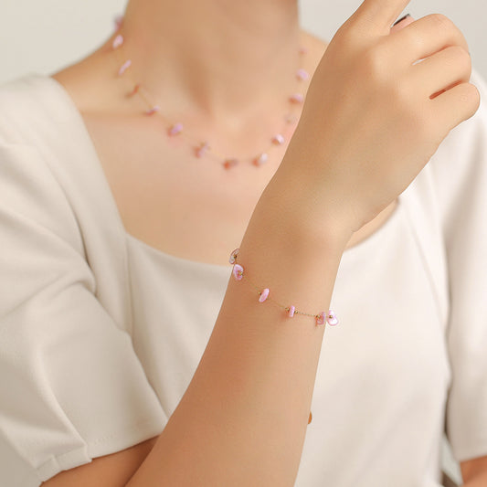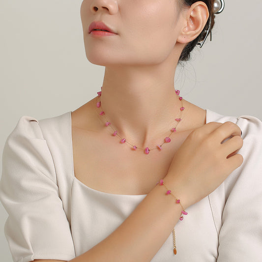 B廠【P119】波西米亞風粉色天然石輕奢感手工鎖骨項鍊手鍊不銹鋼女式精緻套裝 24.09-2