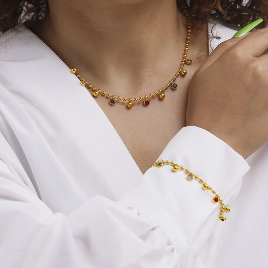B廠【P084】歐美跨國彩色玻璃圓珠鎖骨鍊手鍊小眾ins風精緻鈦鋼鍍18k真金套裝 24.09-2