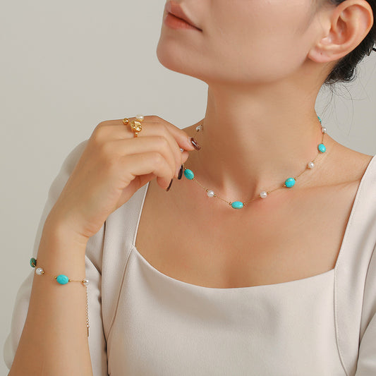 B廠【P118】小眾ins風天然藍松石仿珍珠歐美項鍊手鍊不鏽鋼輕奢感氣質套裝 24.09-2