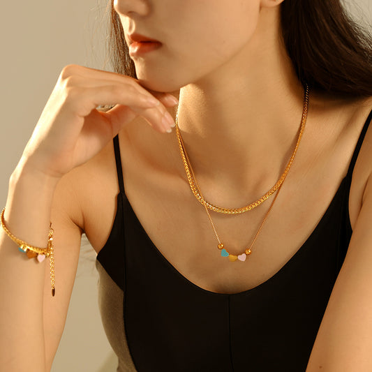 B廠【P096】歐美熱銷彩色滴油愛心雙層項鍊手鍊復古小眾輕奢感不銹鋼套裝飾品 24.09-2